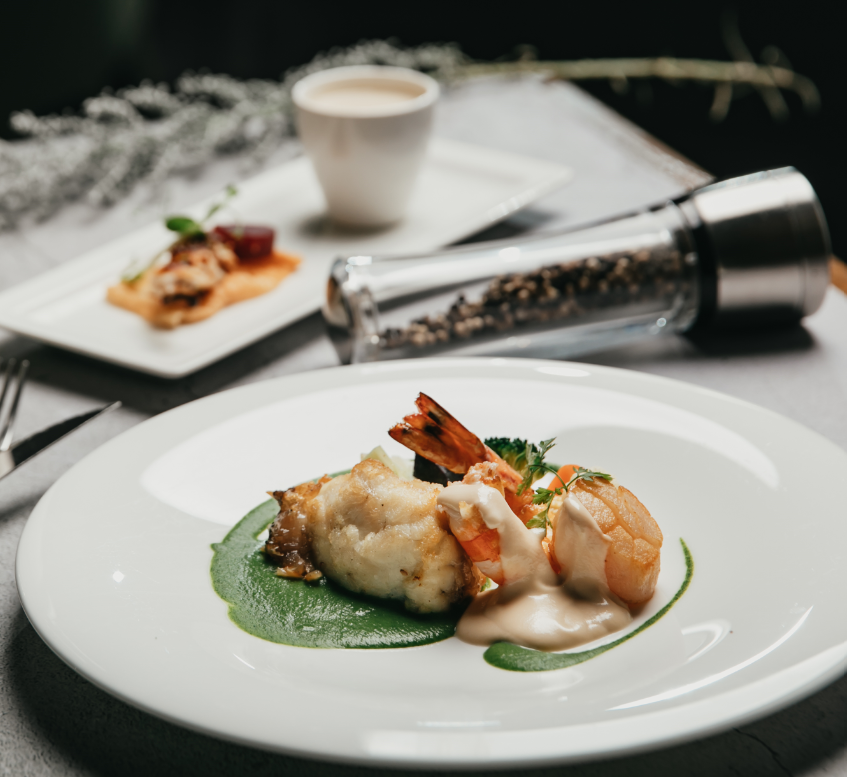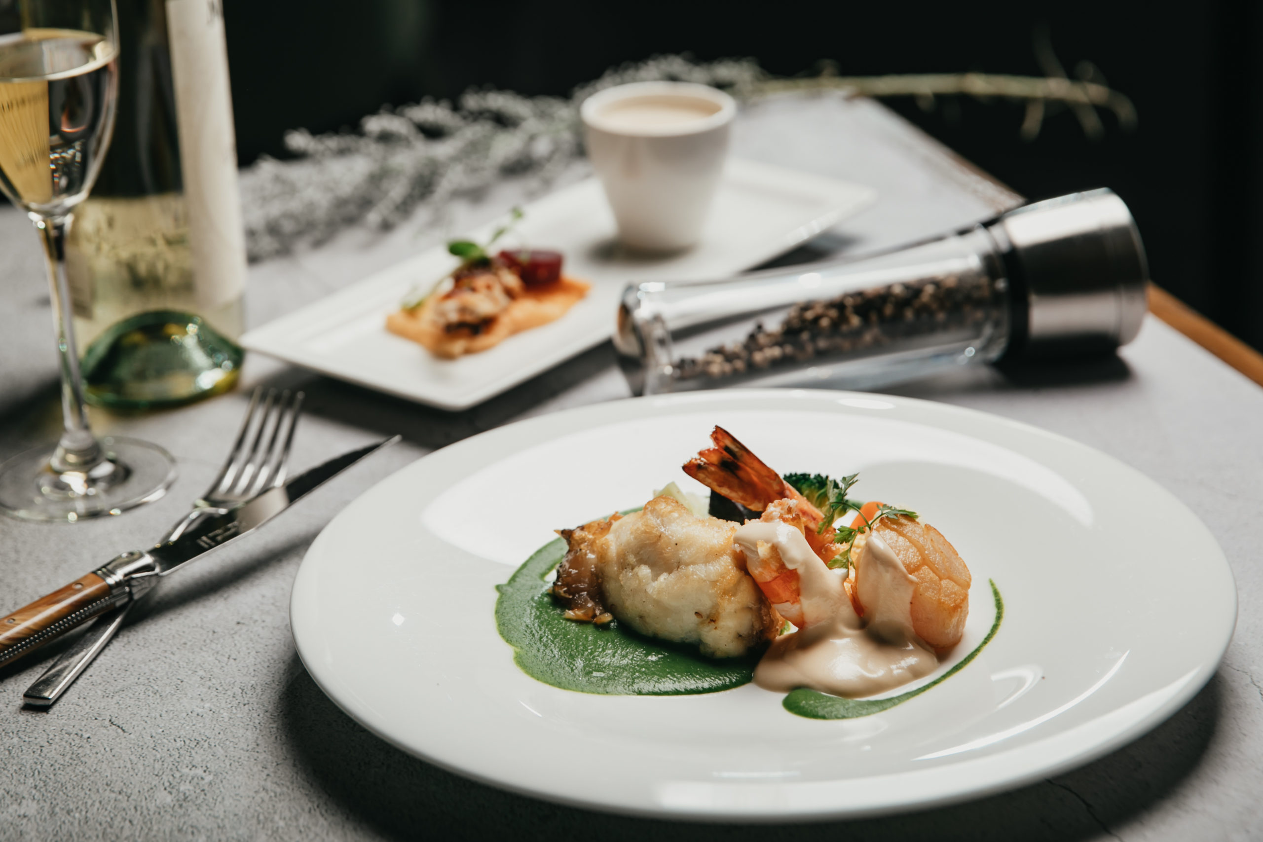 北投麗禧歐陸餐廳全新1880主菜主菜「海魚,明蝦,農夫蔬集,青豆」。(圖片提供北投麗禧溫泉酒店)