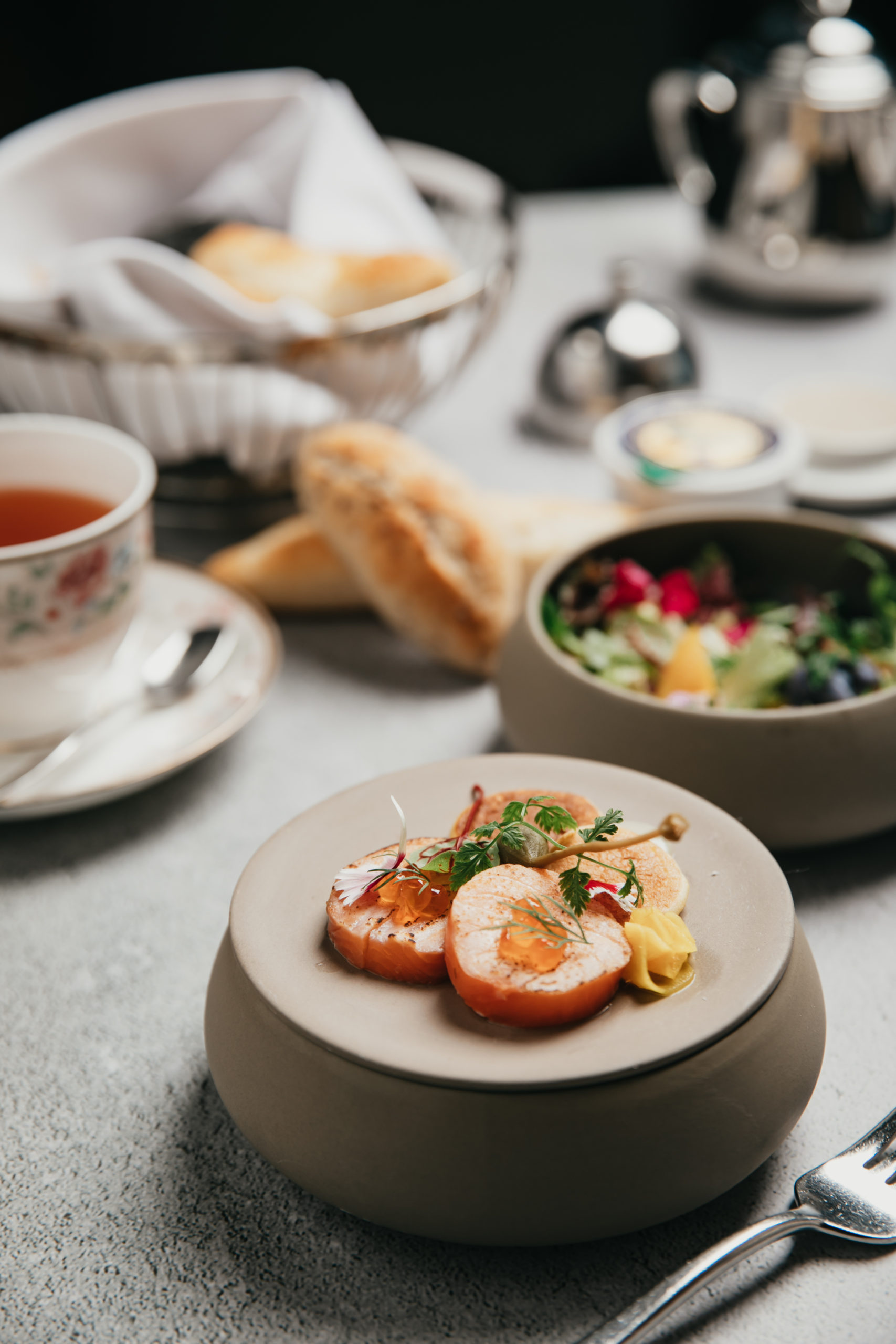 前菜沙拉「低溫熟成鮭魚,小圓煎餅,檸檬奶油,嫩薑」。(圖片提供北投麗禧溫泉酒店)