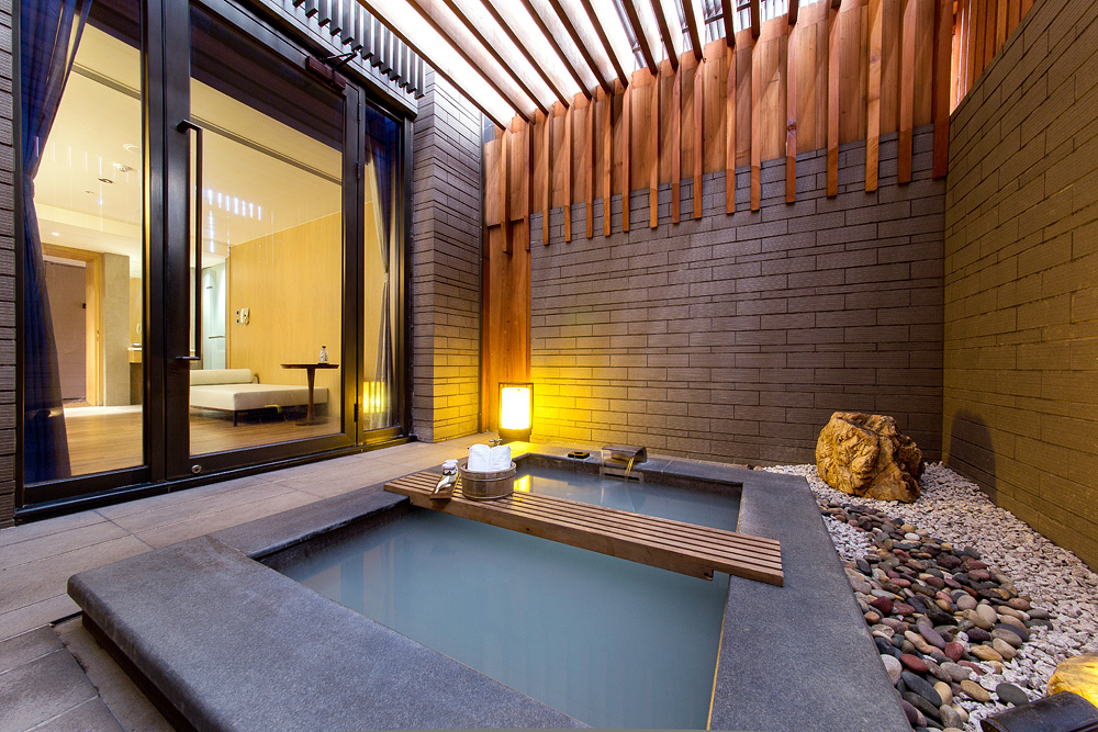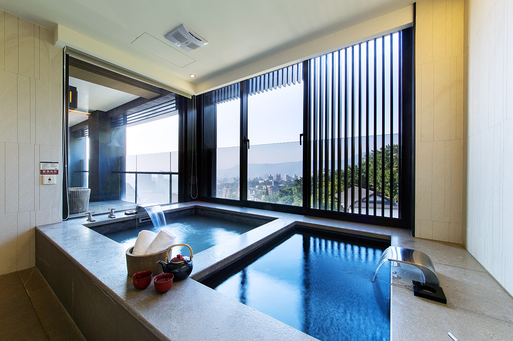 房內冷熱雙湯池,可俯瞰北投夜景、一邊享受著名的白磺泉。(圖片提供北投麗禧溫泉酒店)