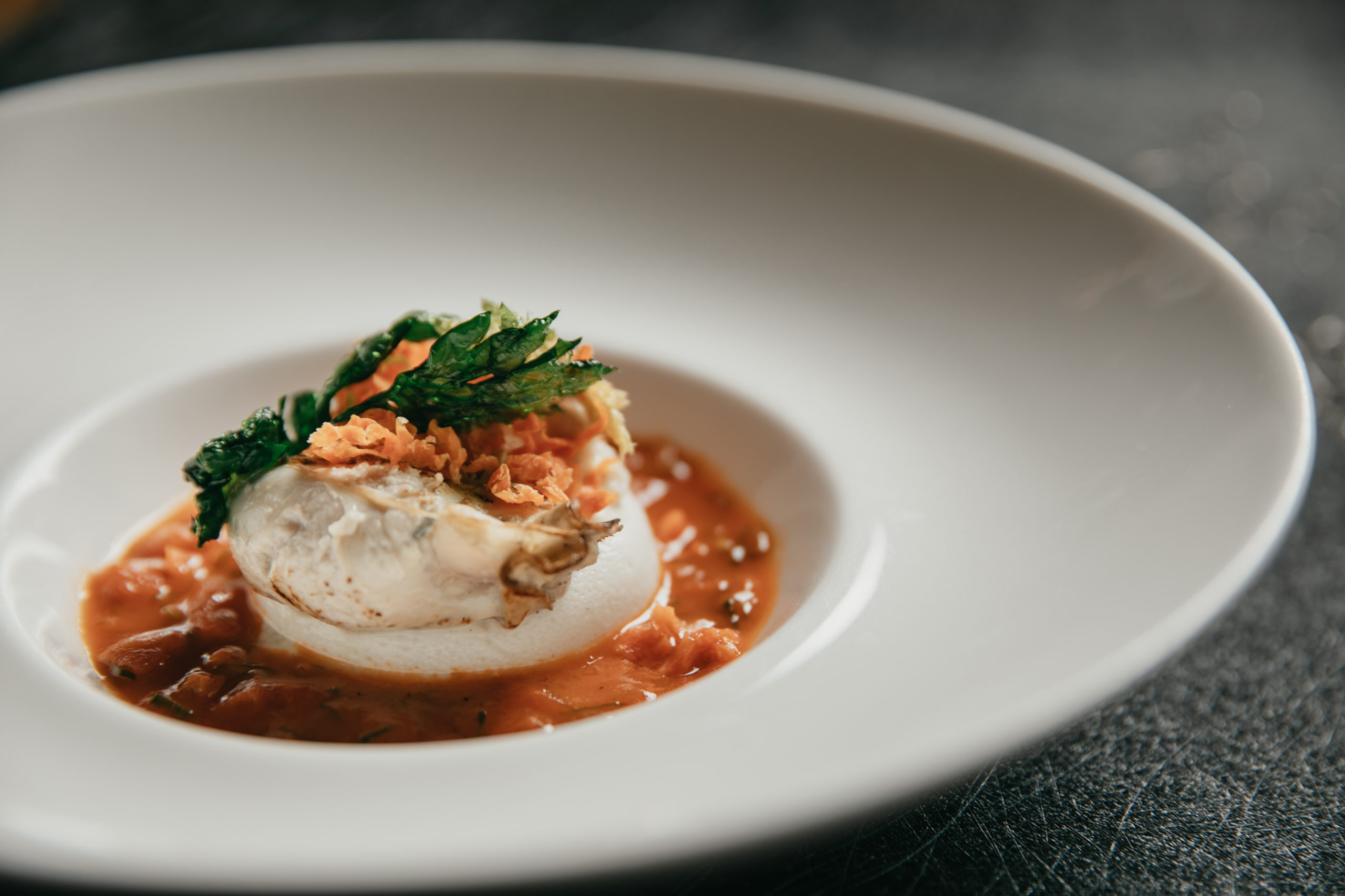 以炭烤的鮮美貝類加上醃漬海藻與藍莓,呈現出層次頗豐的美味菜色。