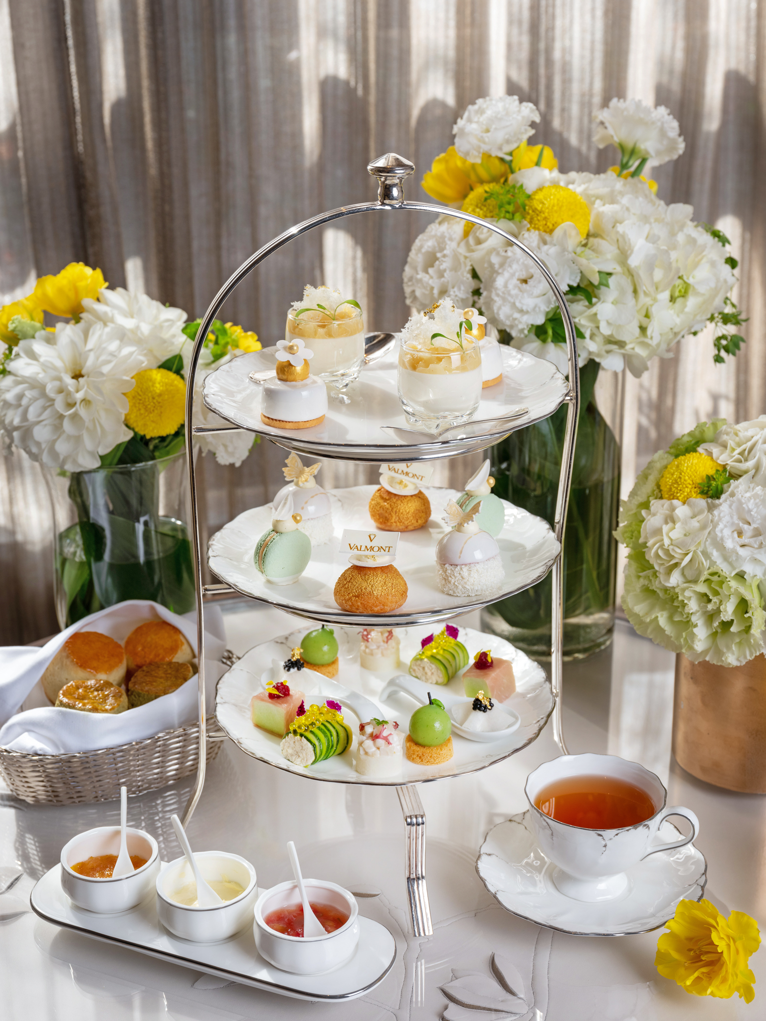 而三層式下午茶除上述甜點之外,也有五款清爽特製鹹點,包括「屹麗御蜂」魚子醬與煙燻雞肉櫛瓜捲、風乾火腿與香瓜佐玫瑰紅酒醬、檸檬鱈魚與醃漬蕪菁、加拿大干貝紅海藻沙拉與洋芋,以及蘋果鴨肝慕斯與布里歐麵包。當然,台北文華東方酒店最受歡迎的經典傳統英式司康必不可少,外酥內鬆軟的司康搭配文華東方自製手工果醬與德文郡奶油(clotted cream),滿足您舒適的春日午後。