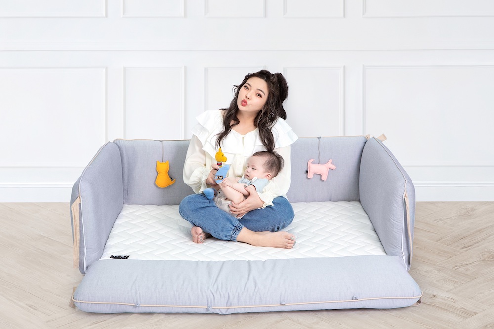 只不過育兒生活並不是事事順遂!雖然米苔目已經是天使寶寶了,但在睡覺這方面,當米苔目開始會坐會爬難以控制時,還曾經發生過摔下床的恐怖經驗,也看過新聞警示覺得真的非常擔心。小甜甜提到,回想起前半年為了怕小孩摔下床不惜將自己跟老公在床上用的各種軟墊棉被來圍成楚河漢界,但愛女心切的小甜甜終究在夜晚還是會睡得心驚膽跳,只好把睡相差總是放飛自我的豬隊友宋先生趕到客廳睡,留下自己幫女兒鞏固床邊,避免摔床憾事發生!好在此時,關注到這張兼具設計美感且能有效幫助新手爸媽的正確育兒床寢–「逗寶gunite落地式沙發嬰兒陪睡床」!不僅能當米苔目自己的獨立睡床,陪睡後還能回歸到和宋先生兩人甜蜜的同床時光,也不用擔心壓到米苔目!