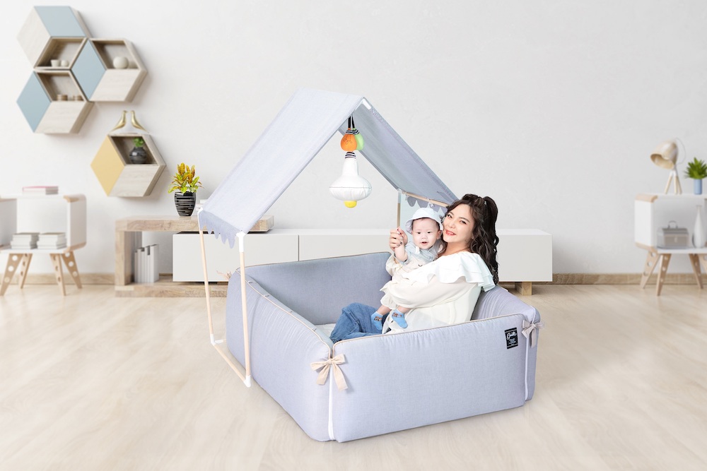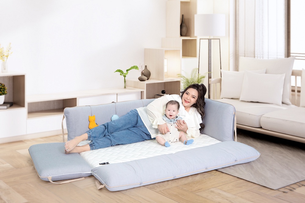 在經歷半年育兒時期,也體會到疫情期間帶小孩出門不容易,那不如在與宋先生建構的三人甜蜜家中幫小寶貝建造一個自主的獨立空間,小甜甜添購了「落地式沙發嬰兒陪睡床」使米苔目在家中就能變換多種型態的成長環境,不僅自行發想了「在家露營」的情境,取代傳統嬰兒床能陪睡又能遊戲,也能讓老公、孩子還有兩隻狗寶貝一起「在家露營」,擁有悠閒的親子時光!