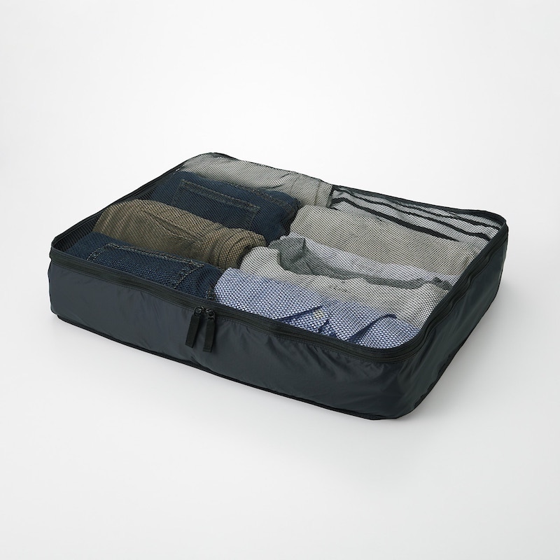 在旅行衣物的整理收納上,MUJI無印良品的再生尼龍可折收納袋適合收納服飾配件,建議顧客可將每天要穿的衣物都先整理收齊並放進單一收納袋內,讓出門前的穿搭更為順手省時,也讓行李箱內的物品看起來整齊清爽。針對需要隨身攜帶的手機、票券與證件,MUJI無印良品推薦可使用撥水加工聚酯纖維隨身側包放置重要物品,附拉鍊的設計也讓隨身物品更安全,拆下肩背帶還可作為分裝袋或化妝包使用,表面經撥水加工處理,不易沾染水性汙垢。