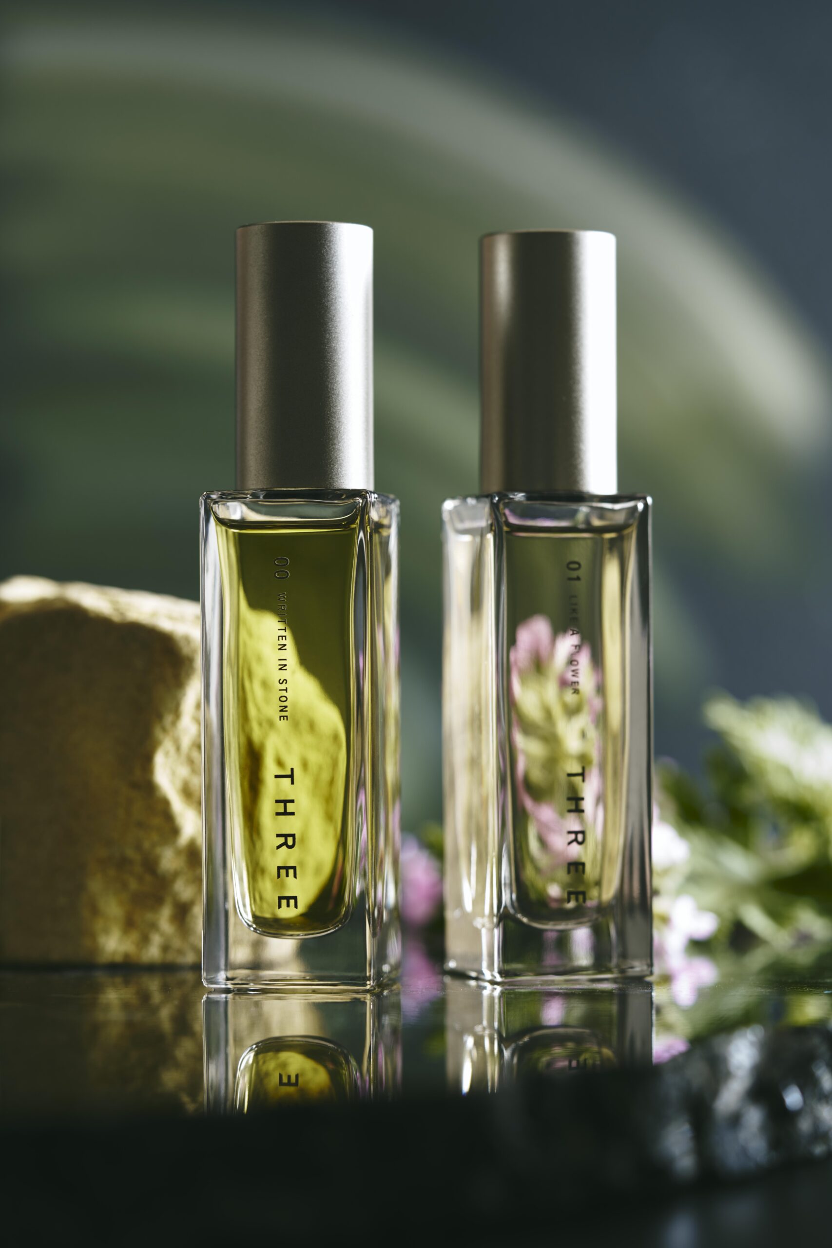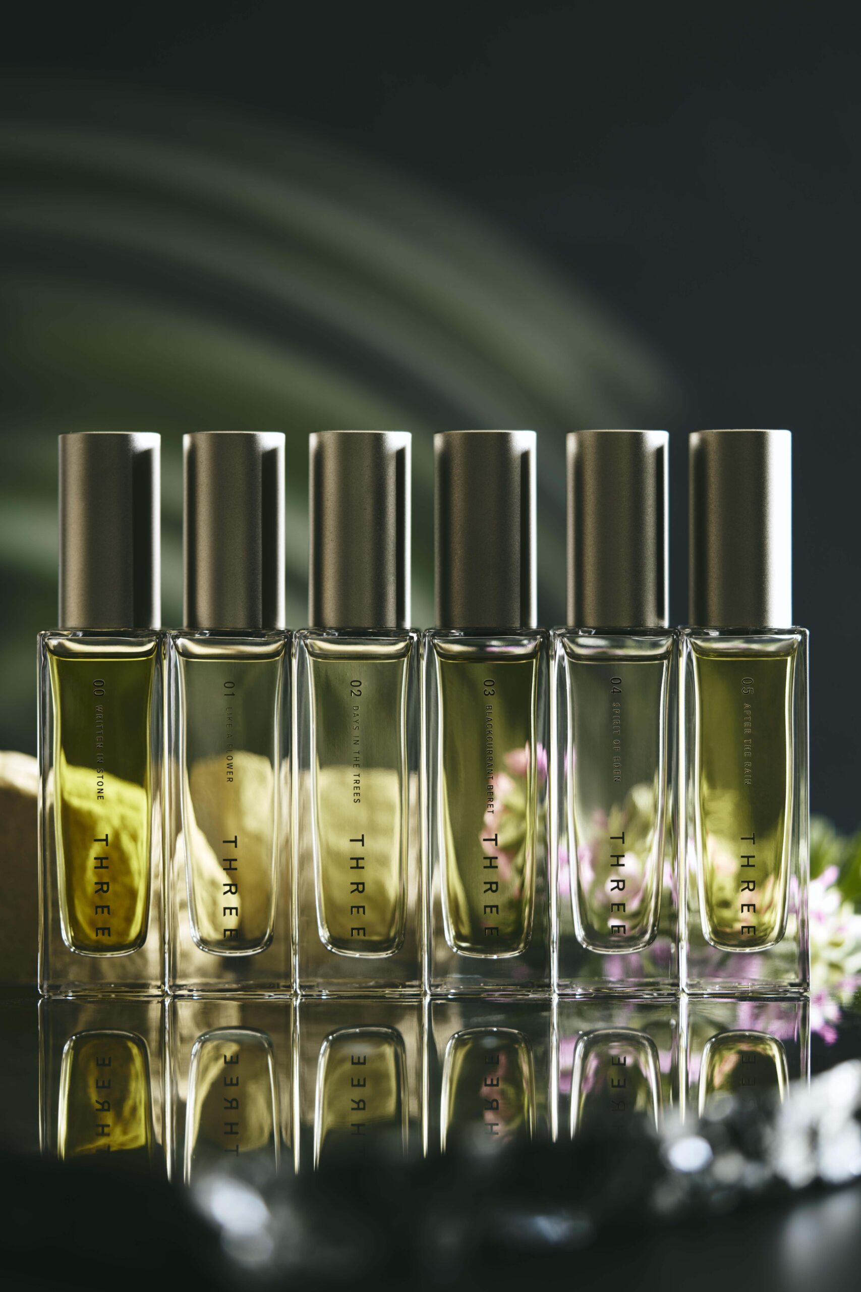 「THREE 精油淡香水R」以 100% 自然來源(依據ISO16128標準,包含水)的植物精油為基底,結合自THREE熊本・南阿蘇自家栽培之原創天竺葵精油與「天然鎖香技術(Aroma Sealing)」,讓香氣以更穩定、細緻且持久的方式層層綻放;六款氣味分別取材「石、花、樹、果實、種子、土」六大自然元素,可單獨使用,也能依心境自由疊香落實於日常儀式之中。
