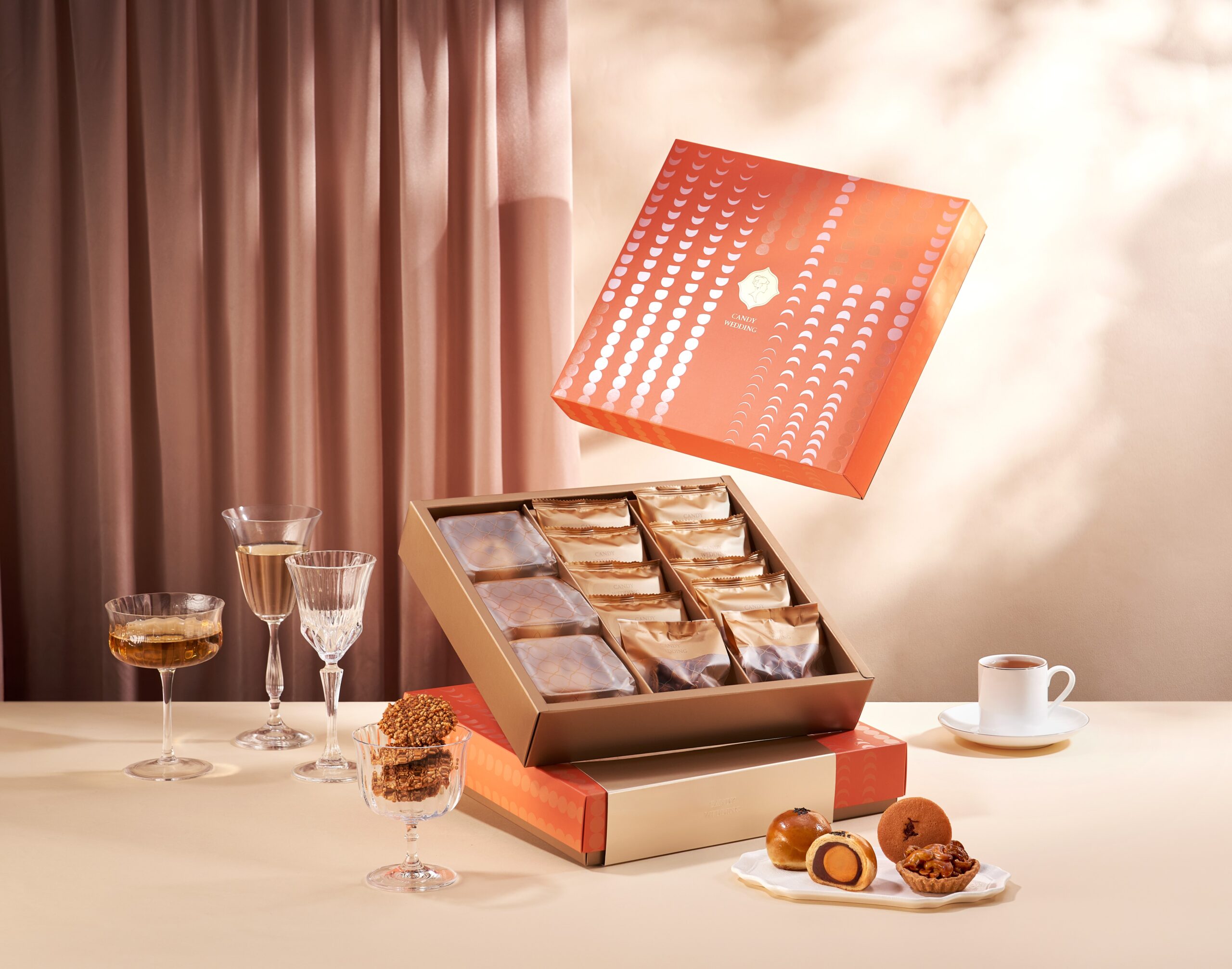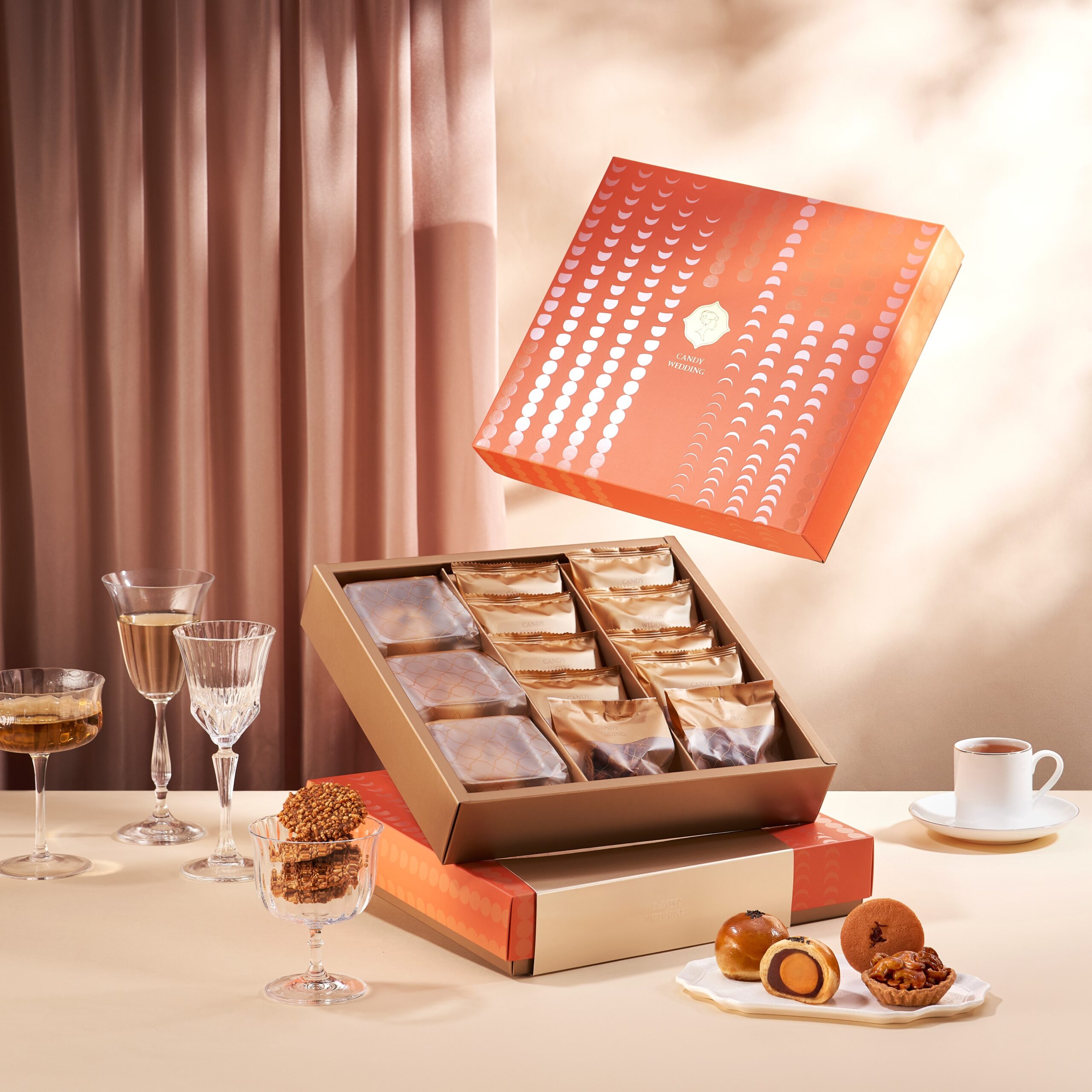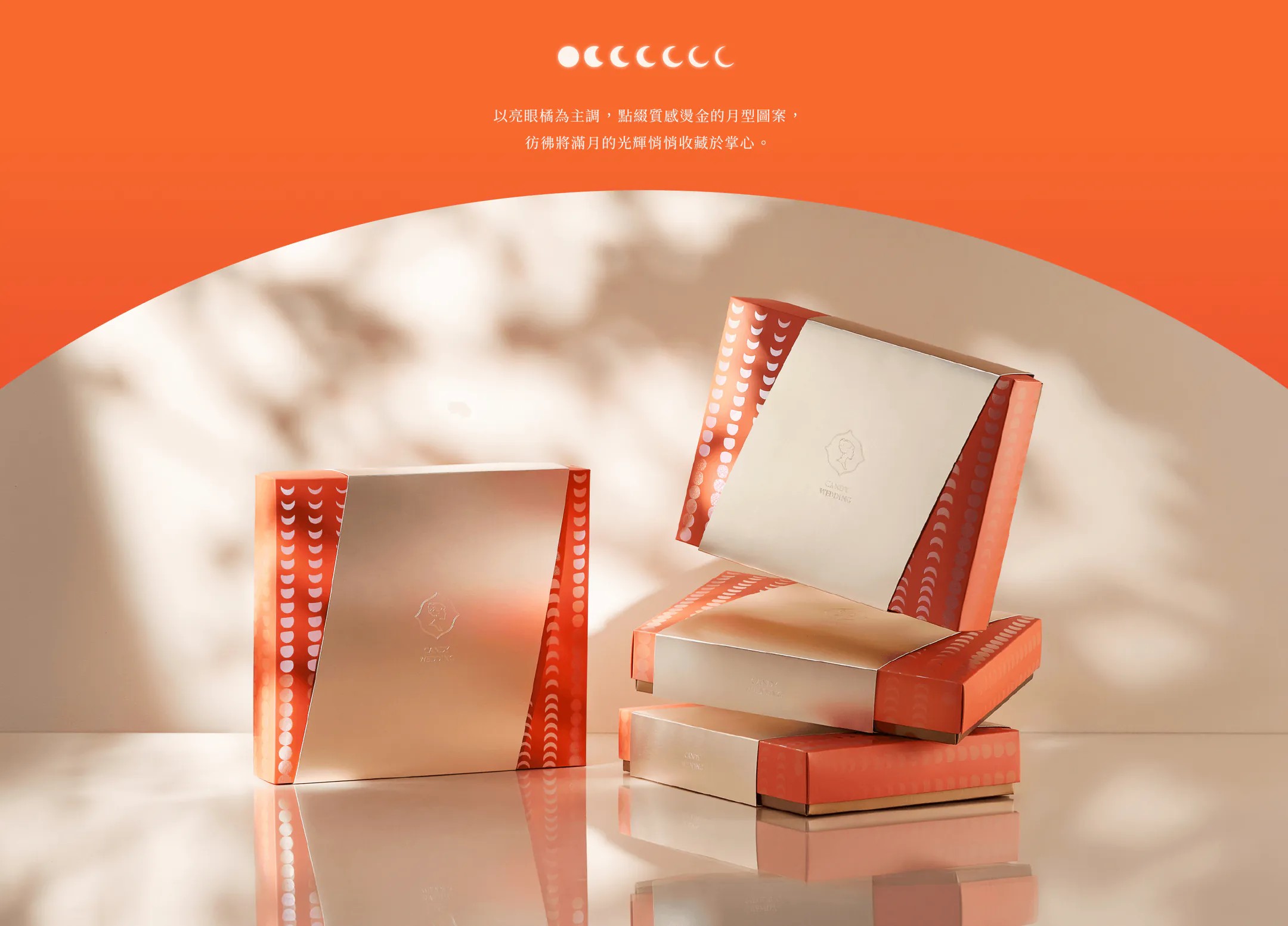 Candy Wedding 2025浪漫「摘月」中秋禮盒以亮眼的鮮橘色為主調,盒身細膩點綴質感燙金的月型圖案,看著月相的陰晴圓缺彷彿一幅藝術畫般讓人著迷,亦像彷彿要將滿月的光輝悄悄地收藏於掌心般撫慰人心。