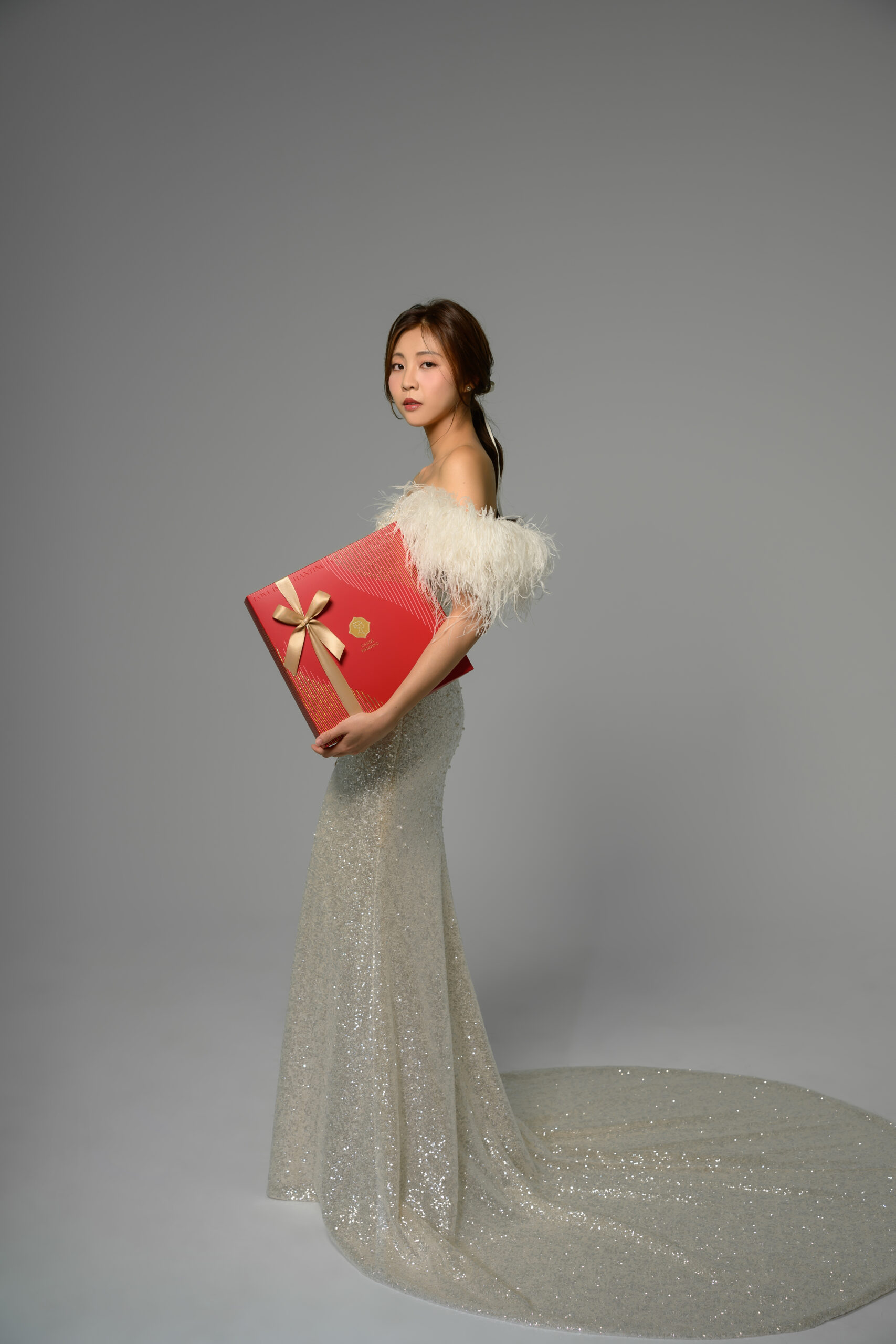 復古女伶迷人風情盡現的Lace & Dolly Atelier 這款落肩綴飾羽毛流蘇魚尾禮服,衣面細緻講究的珠飾與亮片工藝,讓人眼神離不開穿上它的全場焦點女神!