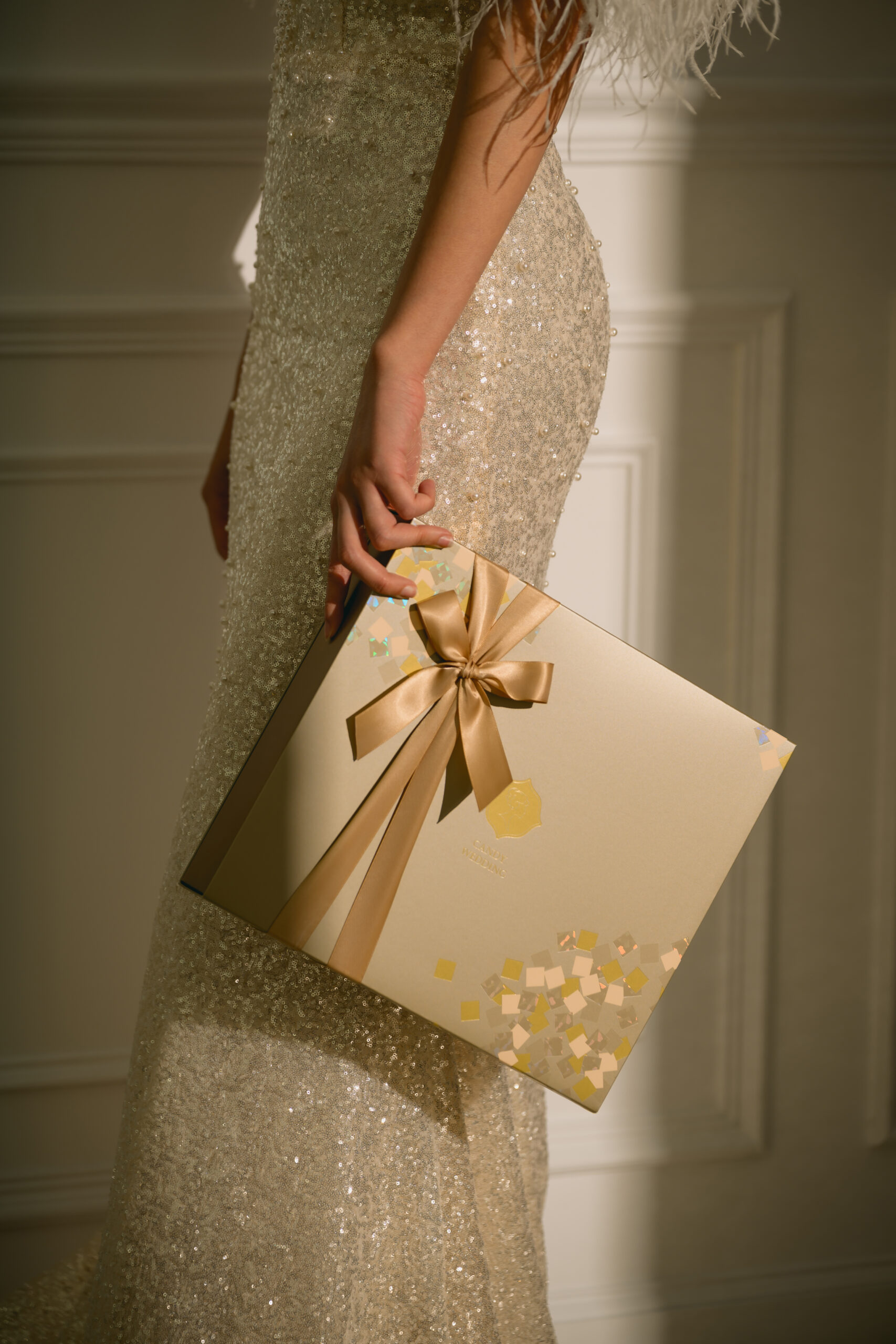 愛情,就像是一場轉角遇到愛的大冒險,讓人悸動卻也深自陶醉。Candy Wedding推出的這款「閃耀時光 LOVE IS SHINE.」禮盒,設計理念來自於婚禮派對的啟發,盒身對角處安排以三種燙金的方式,雷射、透明與金箔多種層次的光澤輝映,正像派對上的Disco Ball迷人的轉動著耀眼光芒,再搭配上Candy Wedding悉心考究如彩帶般的精緻蝴蝶結,更增添婚禮熱鬧慶祝的奪目丰采。
